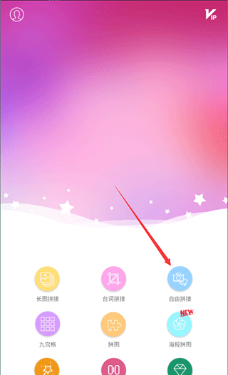 1、打开照片拼图拼接应用程序,根据需要选择拼接方法,点击“免费拼接”功能进入(不想自己动手的可以直接在“海报拼图”中应用模板)。