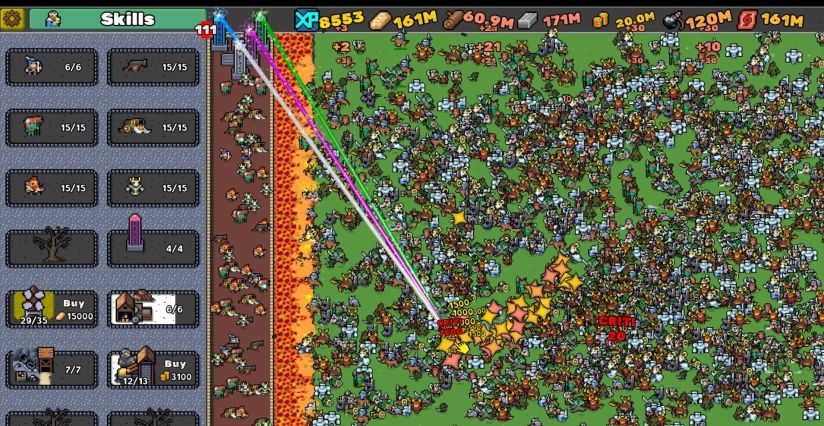 1、敌人不断向你的城墙冲来。你购买防御者、升级生产,看着波次越来越大。