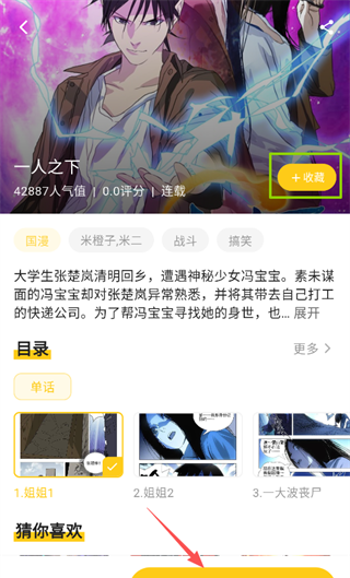 3、在漫画详情页,可查看作品人气、评分、题材标签和剧情简介,点击“+收藏”可将作品加入书架,目录区能快速定位具体章节,点击醒目的“开始阅读”按钮,即可直接进入所选章节的阅读界面。