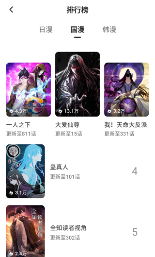 2、进入排行榜页面,可切换日漫、国漫、韩漫分类,页面清晰展示各地区热门漫画的封面、人气值和更新话数,能帮你快速筛选出对应地区的高人气作品,精准找到口碑佳作。