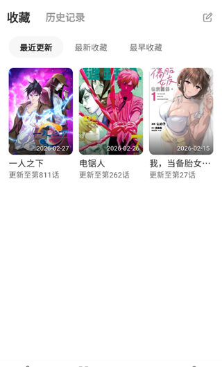 5、点击底部“书架”,可在收藏和历史记录间切换,收藏页支持按最近更新、最新收藏、最早收藏排序,清晰展示已收藏漫画的更新时间和最新话数,自动同步阅读进度,让追更管理更高效。