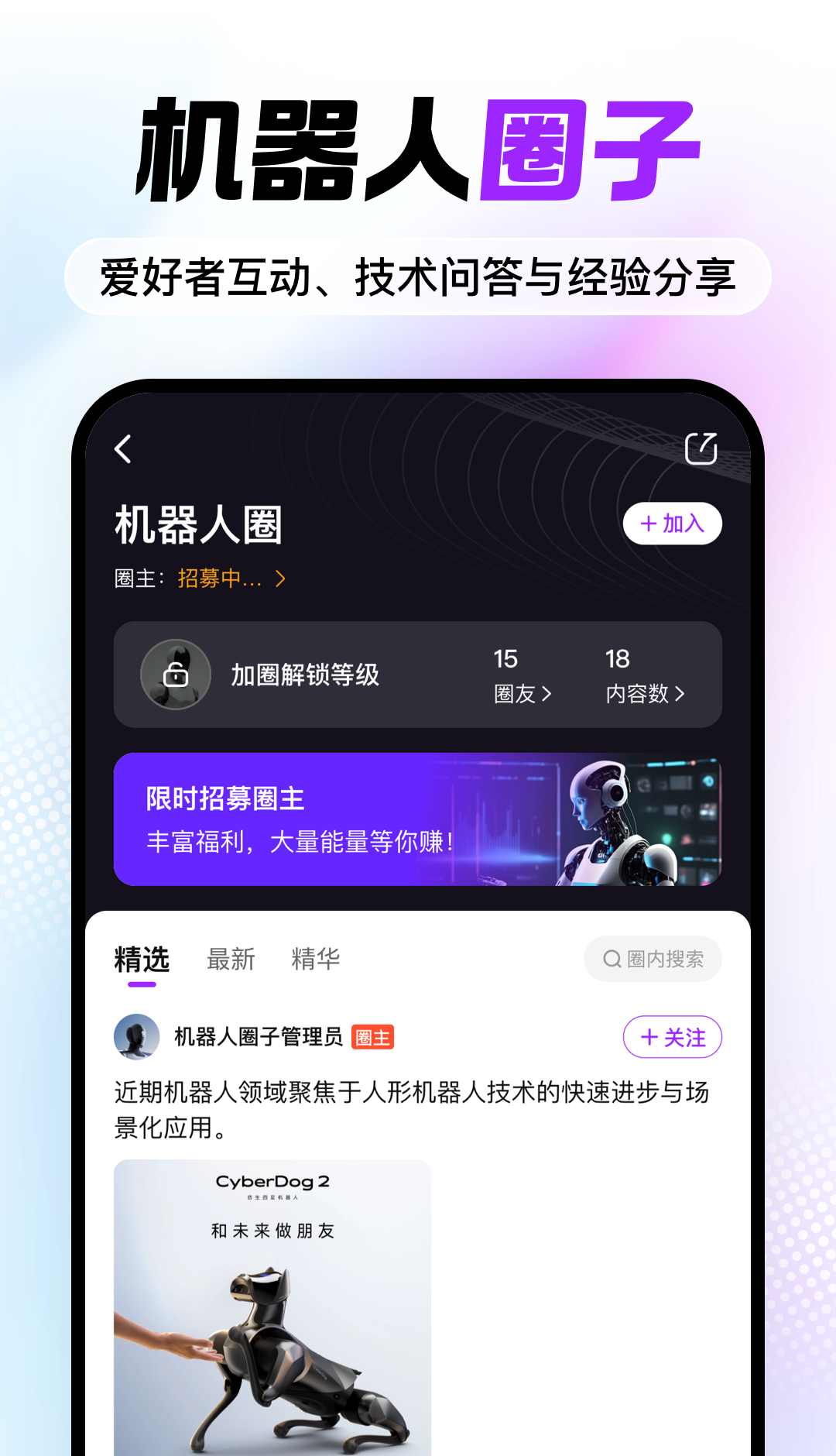 6、进入机器人圈,浏览热门话题,参与讨论,与爱好者和从业者互动交流。