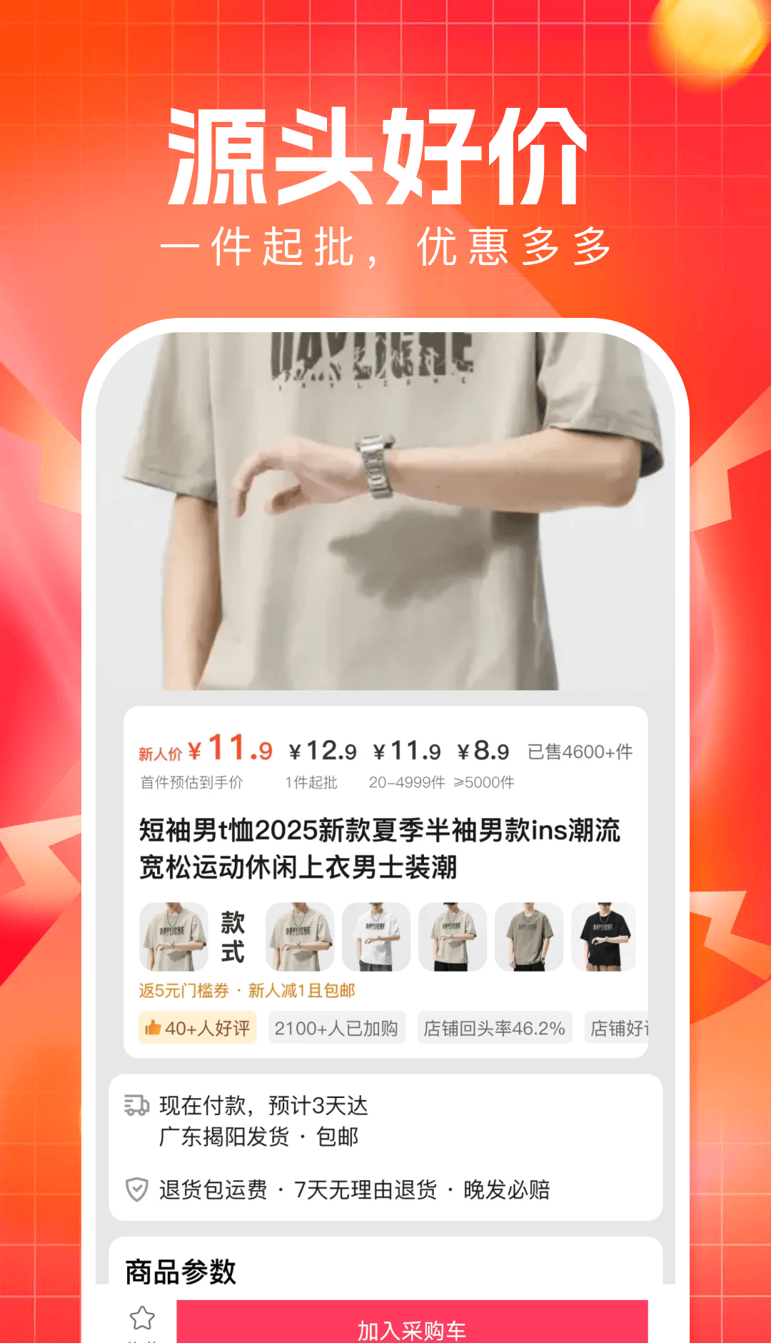 5、针对批发类货源商品,可在货源专区查看批量拿货价格、供货详情,按需选择批量下单或单独采购。