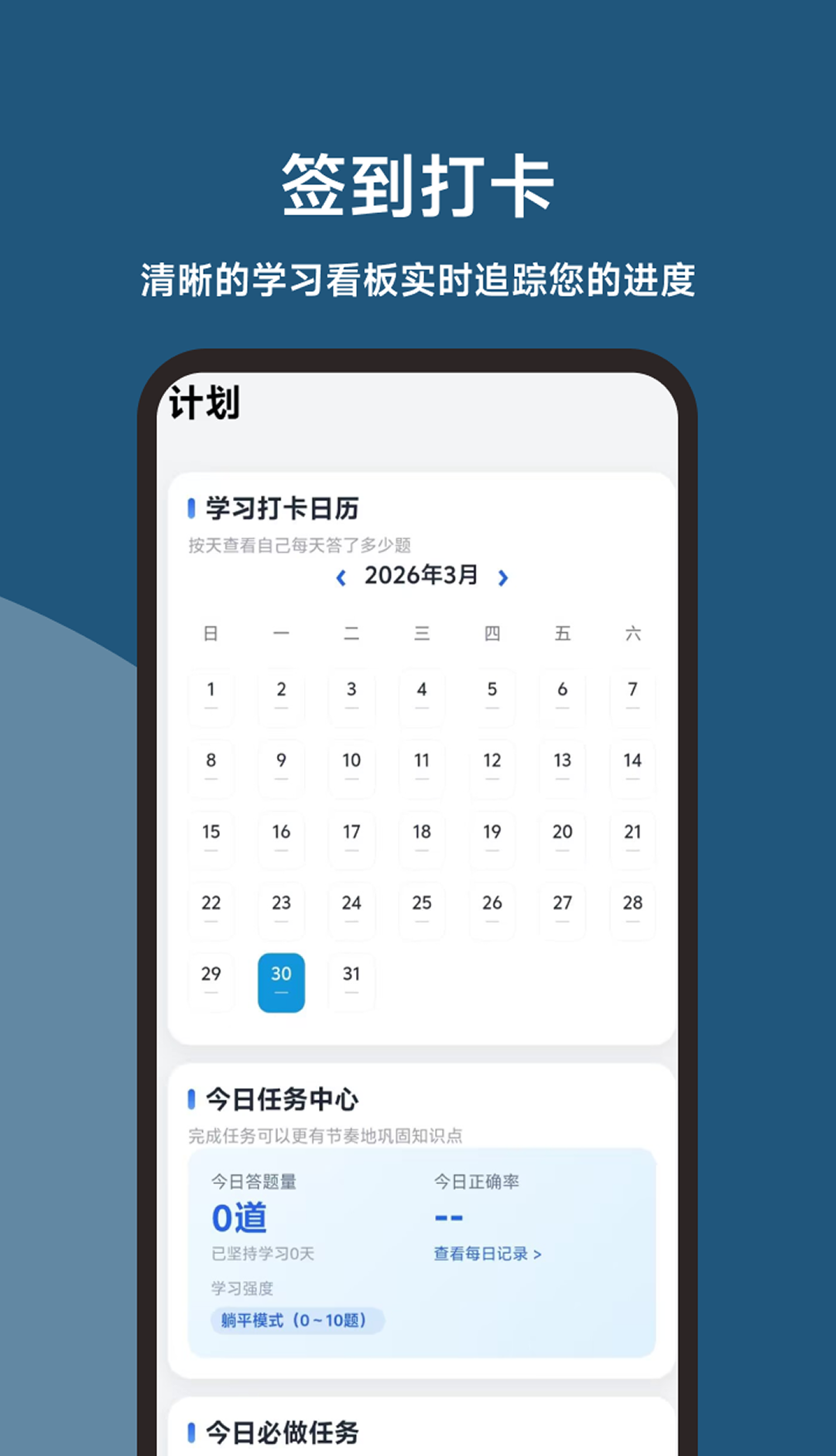 通过学习打卡日历可视化追踪每日答题量与学习天数,清晰掌握备考进度,告别三天打鱼两天晒网。