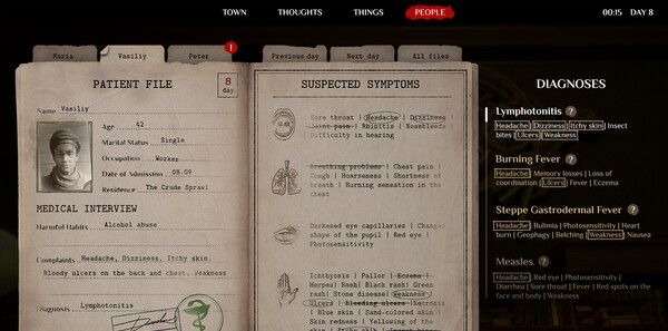 玩家需扮演真正的医生,通过检查患者症状、交叉诊断疾病,并制定防疫政策(如隔离、宵禁、疫苗接种)。这些决策直接影响小镇的命运,可能引发居民的憎恨或支持。