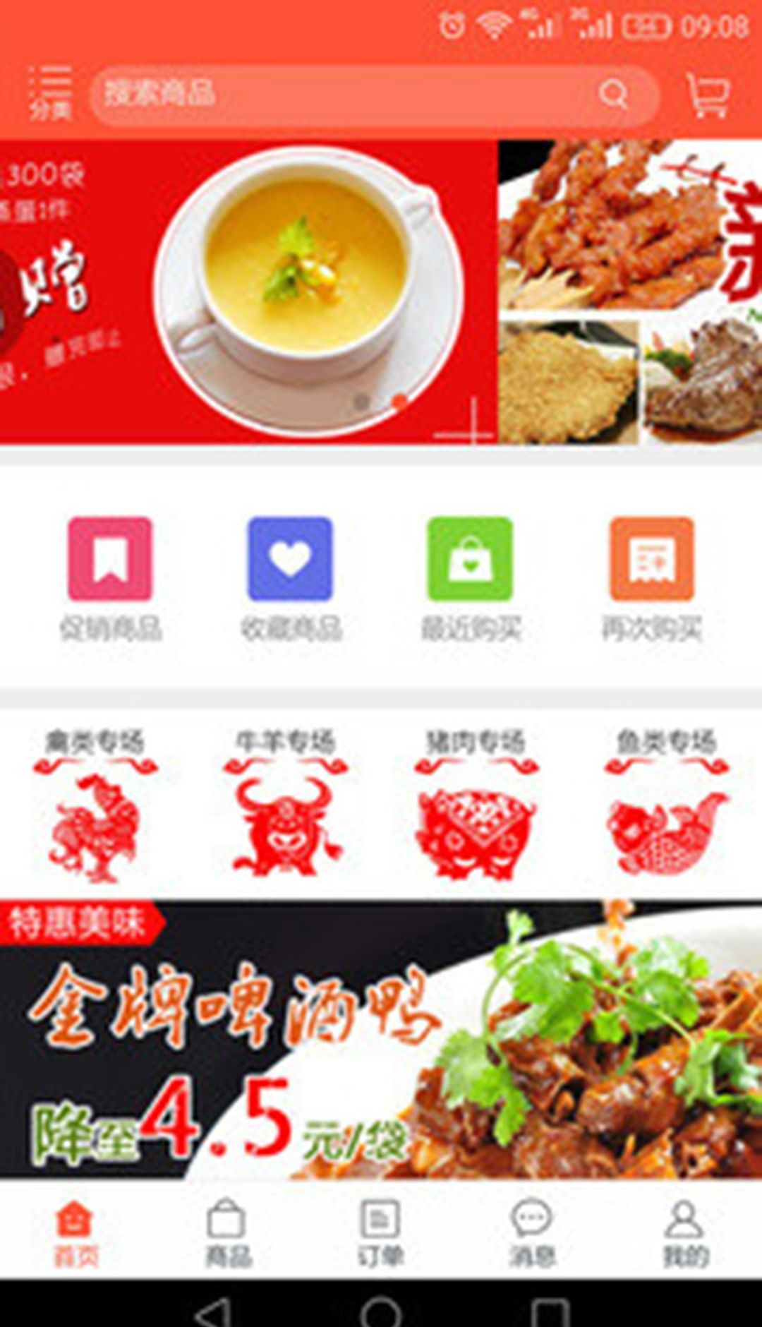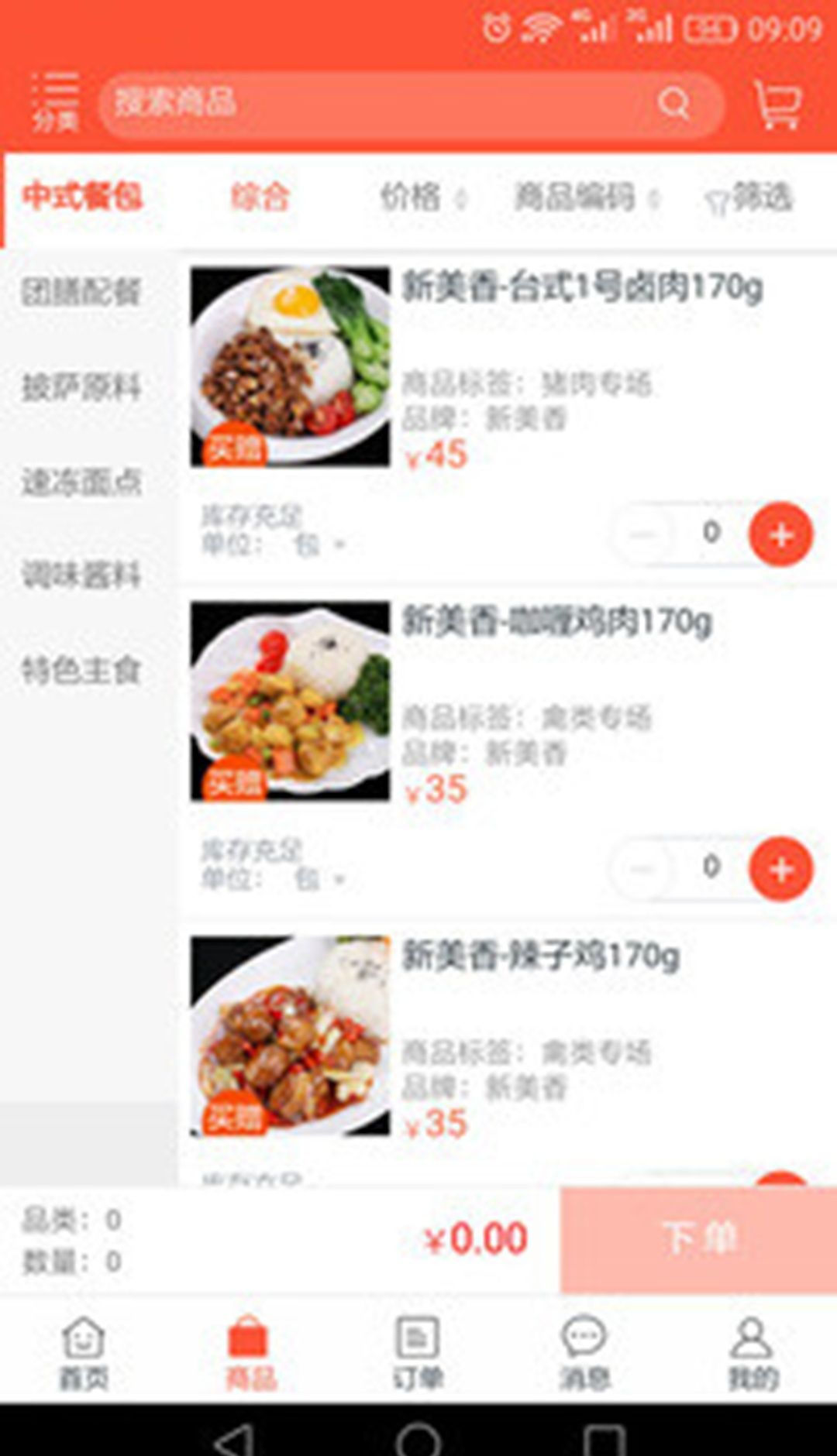 该 APP 对食品产品进行了明确的品类划分,支持餐饮商家快速浏览、比价、下单采购,流程简单方便,轻松完成食品采购流程。