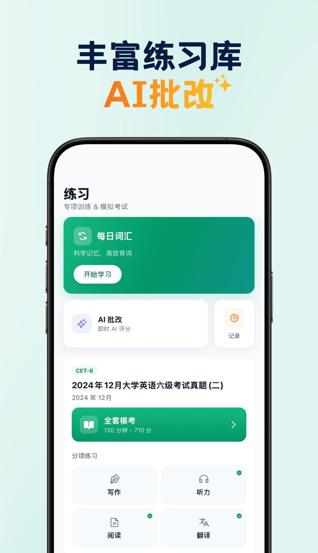 鹦鹉智学是一款专为大学生设计的英语四六级备考软件。通过该软件,学生可以准备大学英语四级和六级考试,让他们学习词汇,语法,听力,阅读理解和写作表达。这样可以提高他们的英语学习效果,帮助他们提高四六级成绩;最新版本的鹦鹉智能学习拥有智能 AI 分析模式,自动分析整理你的英语问题。结合考试时间,为你组织最适合的学习计划,让你每天通过软件完成学习任务,练习更多真实的考试资源,让你的四六级备考更加高效。有需要的用户现在就可以下载,以后你参加四六级考试会更轻松,帮助考生通过考试!