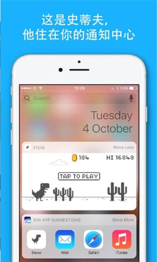 Steve这款游戏不需要任何网络,就可以打开来玩,Steve是一只住在你的通知中心的小恐龙,和它一起成长,它可以给我们带来很多欢乐,游戏中有各种风格迥异的地图关卡等你来挑战,玩家只需将通知栏下拉即可看见这只可爱的小恐龙,小心各式仙人掌,乌鸦等物体,风格各异的地图关卡等你来挑战。