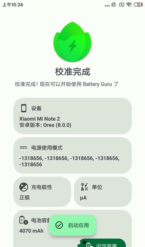 2、校准完成后,会显示电池的一些基本信息,点击启动应用。