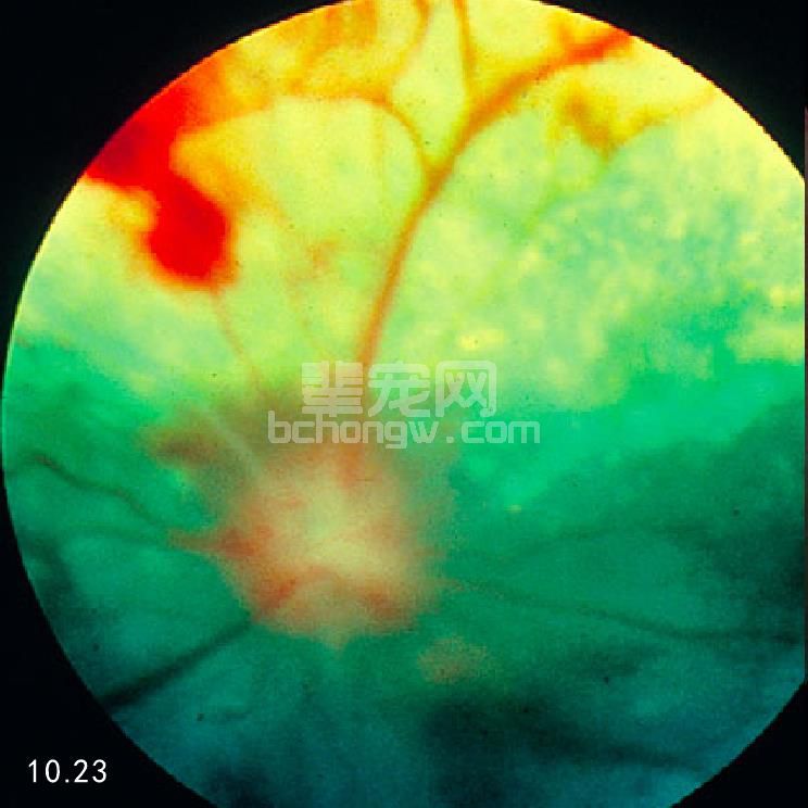 图10.23 患有肾衰竭和肾高压的犬表现为视网膜出血、玻璃体混浊、视网膜水肿和视神经炎。