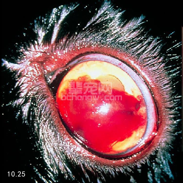 图10.25 患有系统性高血压的猫,表现为眼前房出血。
