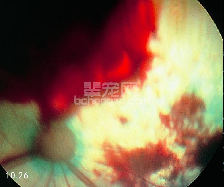 图10.26 猫高血压性视网膜病,表现为玻璃体背侧出血和视网膜内出血。