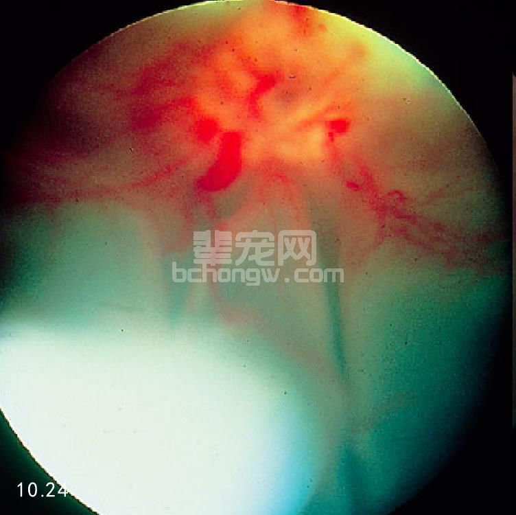 图10.24 患有系统性高血压的犬,表现为大面积视网膜重叠、脱落和玻璃体下出血。