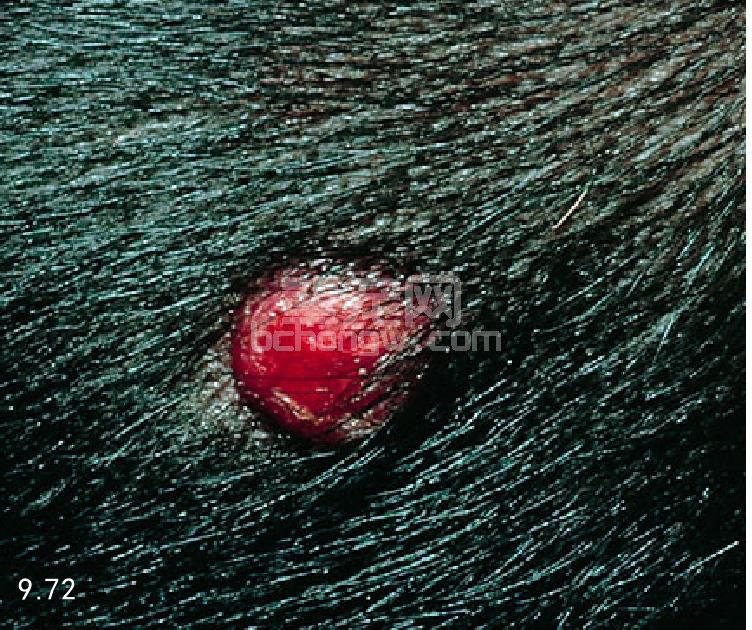 临床症状 四肢末梢、耳廓或头部可见独立的结 节组织,在有些病例可见有复杂性的结节组织。少数 病例可见引流淋巴结,或向皮下扩散的淋巴结。这些 淋巴结通常为小的、坚硬圆形纽扣状(图9.72),边界 清晰,常可转为溃疡。