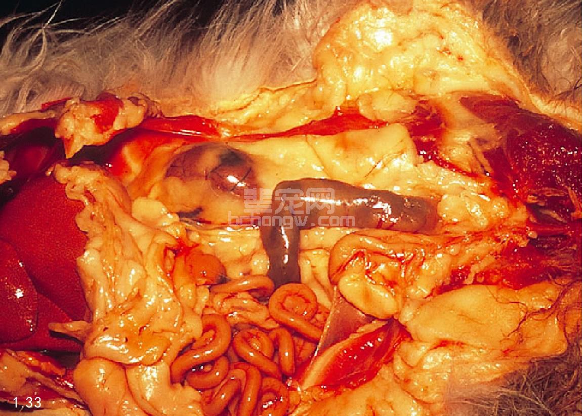 图1.33 患嗜血巴尔通氏体病的1龄猫,此猫有严重溶血性贫血,剖检可见 黄疸和脂肪肝。