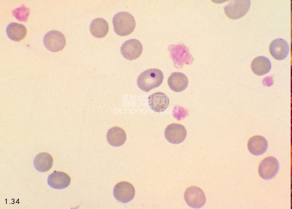 图1.34 猫的外周血涂片,可见红细胞表面有轻微变形的猫嗜血巴尔通氏体。