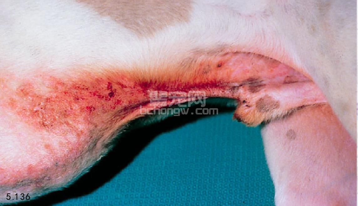 图5.136 小灵犬的包皮过长,妨碍正常排尿,尿液浸渍导致腹侧皮炎。