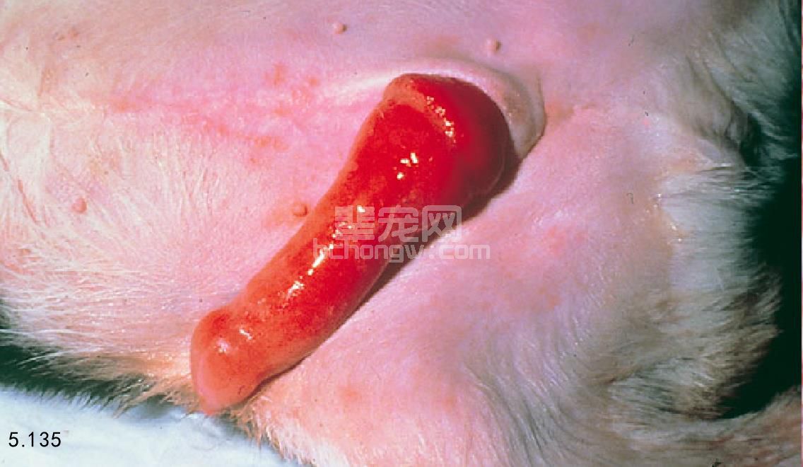 概述 包茎发生于获得性或者先天性的狭窄阴茎包皮开口,阻碍阴茎的伸出。箝顿包茎系指阴茎不能缩回到 包皮中(图5.135),猫很少发生。阴茎异常勃起症是指阴茎持续的勃起。