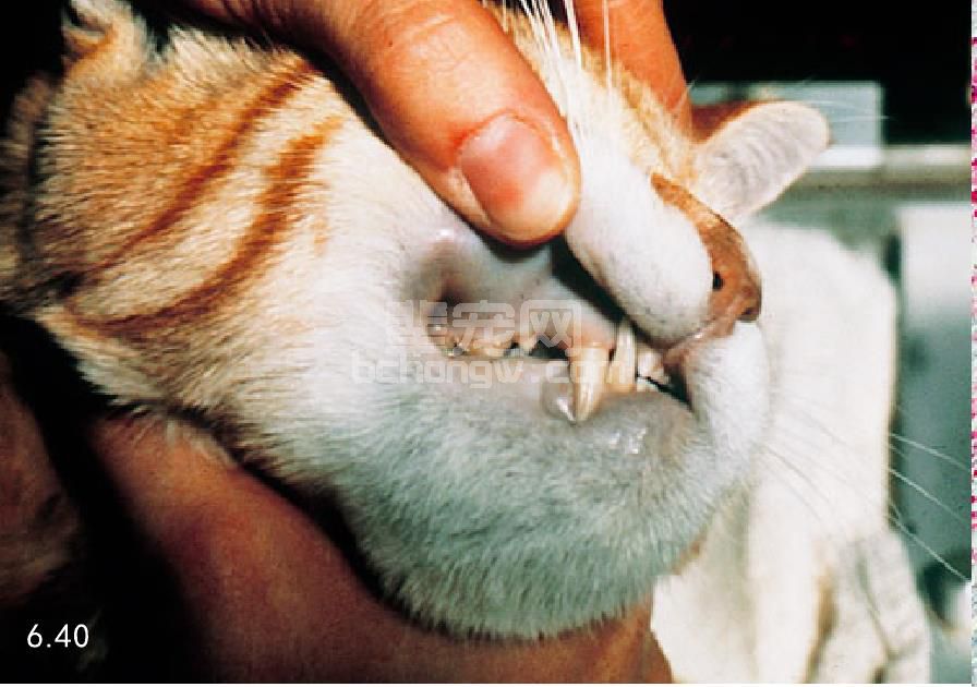图6.40 醋氨酚中毒引起高铁血红蛋白血症的猫齿龈蓝灰色。