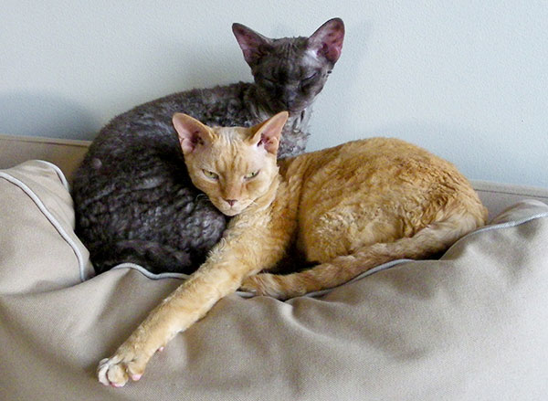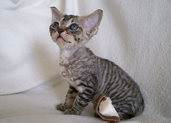短而细腻,纠缠,波浪形,护毛有或没有。被毛没柯尼斯卷毛猫那么整齐微微带野性,似卷毛狗或绵羊。有些德文卷毛猫猫在腹部只有底层绒毛。