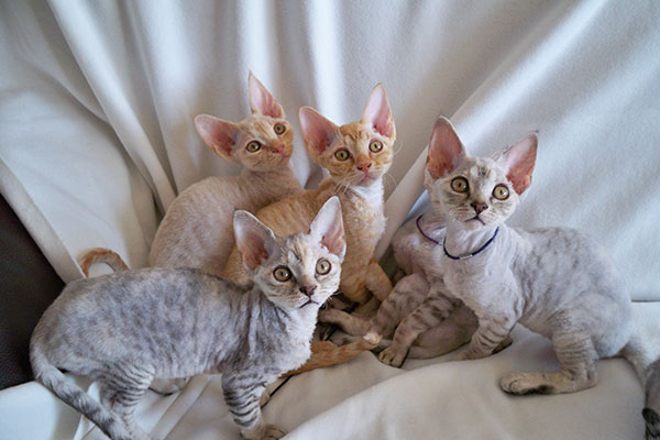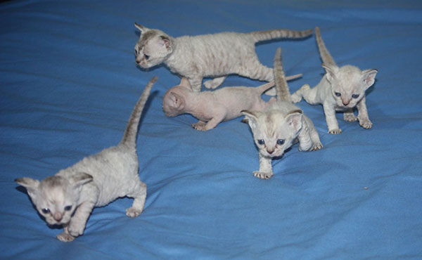 短而细腻,纠缠,波浪形,护毛有或没有。被毛没柯尼斯卷毛猫那么整齐微微带野性,似卷毛狗或绵羊。有些德文卷毛猫猫在腹部只有底层绒毛。