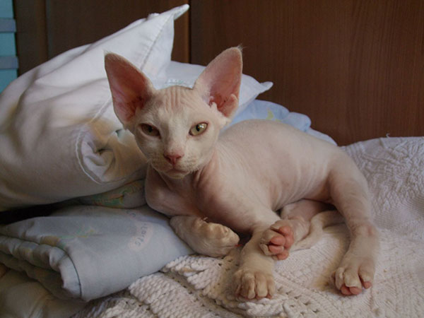 德文莱克斯猫身材苗条,肌肉强健,四肢修长纤细,尾巴从尾根到尾端渐细,尾端很尖。它长着“V”字型的头,颧骨很高,颌部 有力,吻部短而窄,鼻子也短。它的前额向后弯曲,一直到颅骨为止。耳根宽,双耳大,位置低,显得这种猫很顽皮。它的眼睛很大,呈椭圆形,位置略有些倾斜。 和德国莱克斯猫一样,德文卷毛猫的毛发也是卷的。但是它们短而细腻、纠缠、波浪形,护毛有或没有,被毛没德国莱克斯猫那么整齐微微带野性,似卷毛狗或绵 羊,而有些德文莱克斯猫在腹部只有底层绒毛。