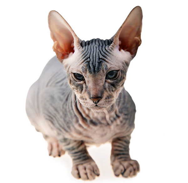 加拿大无毛猫,毛发稀疏,在耳、口、鼻、尾前锻、脚等部位有些又薄又软的胎毛,其它全身部分均无毛,皮肤皱褶似羚羊皮,有弹性,越年轻的猫的面部越圆,皮肤的皱纹越多;刚生下的小猫身上就有许多皱纹,并布满了柔细的胎毛,随着年龄的增长,绒毛仅残留于头部、四肢、尾巴和身体的末端部。已经培育出所有猫的颜色,这些颜色全显现在皮肤上,但眼睛颜色与体色相称。在它们身体上本应该出现暗色皮毛的地方,会有色素存在。