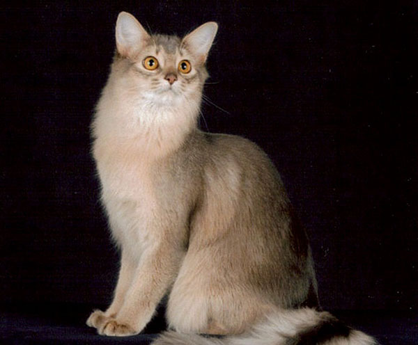 索马里猫外形相貌,基本上与阿比西尼亚猫一样,身材苗条优美,略圆;身型属中至大,比例均匀,肌肉结实,线条优美。一对大耳朵呈宽的“V”字形;杏仁眼,黑眼皮。初生时是一身短毛,会随着猫长大而渐渐变的平滑和富有光泽。被毛中等长度,相当柔软、细而浓密,在肩部较短,但在后腿上却有着长毛,尾毛也十分浓密。毛色有栗银白色、棕红色、深红色、蓝色、银乳黄色、淡紫色、蓝银白色、银白色、巧克力银色等十一、二种之多。其中深红色,最为普遍。所有的索马里猫的眼睛都是琥珀色、浅褐色或绿色的。