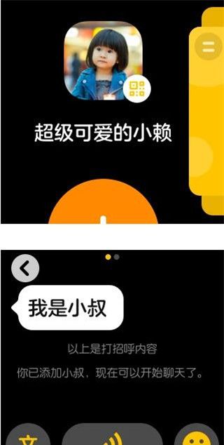 二维码方式:在侧边栏轻触头像会出现用户的二维码名片,其它人可通过微信扫码发起朋友请求,在手表上确认后,即可添加成功。