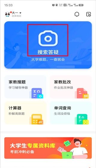1、打开作业帮在线拍照解题,进入到首界面中之后,在该页面的正上方位置我们找到搜索答疑这个图标按钮,点击进入。