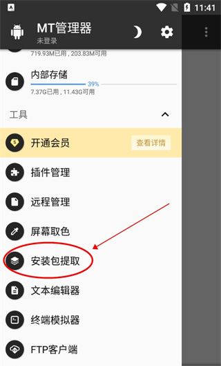 1、打开在乐乐游戏网下载好的MT管理器,点击左上角选项并点击安装包提取;