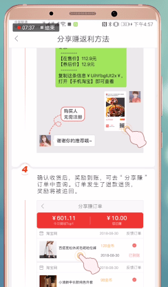 8、还可以通过分享的方式来赚返利,即在喜购app中找到心仪的商品,复制淘口令或者分享图片给好友,任何人通过你的分享购买商品,你都可以赚取佣金,确认收货后,奖励到账。若订单退款退货,奖励将被追回。