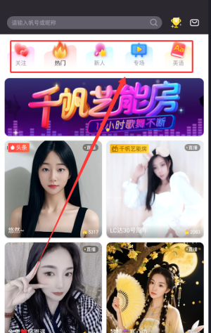 3、直播板块提供关注主播、热门内容、新人推荐及主题专场分类浏览。