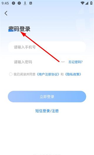 2、密码登录界面,需输入手机号和密码,勾选同意用户注册协议和隐私政策后点击立即登录,若忘记密码可点击对应选项找回,也可选择短信登录、注册方式。