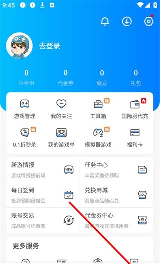 1、进入我的界面,可看到平台币、代金券等信息,还能使用游戏管理、我的关注、工具箱等功能,参与新游情报、每日签到等活动,享受账号交易等更多服务。