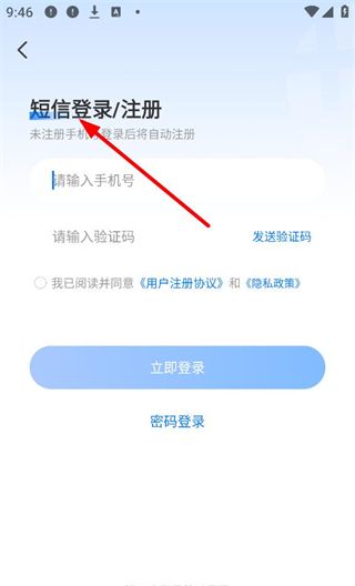 3、短信登录、注册界面,输入手机号并获取验证码,勾选同意相关协议后点击立即登录,未注册手机号登录后将自动注册,也可切换为密码登录方式。
