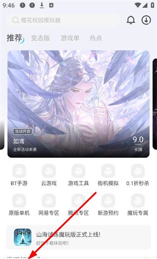 4、进入首页界面,可浏览推荐、变态版等分类游戏,查看如如鸢等游戏推荐,使用BT手游、云游戏等功能入口,了解山海试炼魔玩版等新游上线信息。