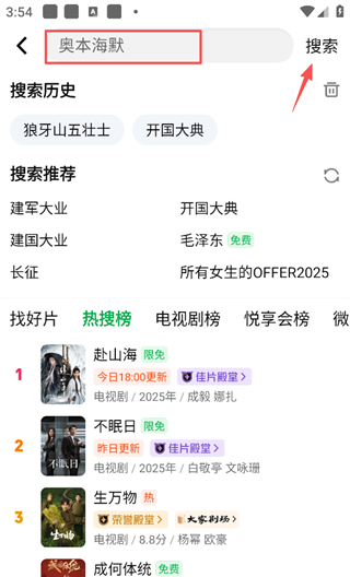 2、在搜索框中输入需要下载的视频,随后点击屏幕右上角的“搜索”。