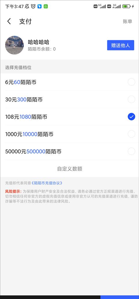 4、在陌陌币的充值下一步就可以看到一个蓝色的“赠送他人”的按钮,我们在这里就可以给别人充值赠送陌陌币。