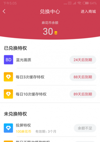 4、如果你想缓存视频,你需要交换权限。点击我的,点击我的兑换中心,兑换炸面团扭曲硬币以获得特权。炸面团扭曲硬币将被发送用于观看视频和执行任务。