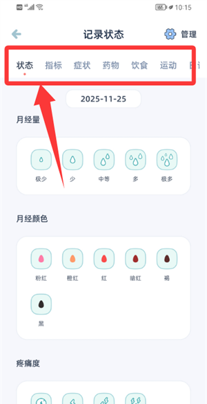 3、通过记录页面上的分类选项填写月经状况等详细信息。