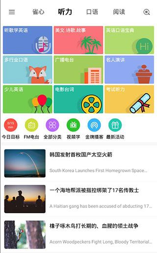 3、然后是听力页面,用户可以在这里选择自己喜欢的类别进行收听,这些类别包括听歌学英语、美文诗歌故事、英语口语宝典、多行业口语、名人演讲、少儿英语、电影台词、考试听力,下方还有今日目标、全部分类、视频学、金牌播客、最新活动以及一些新闻资讯。
