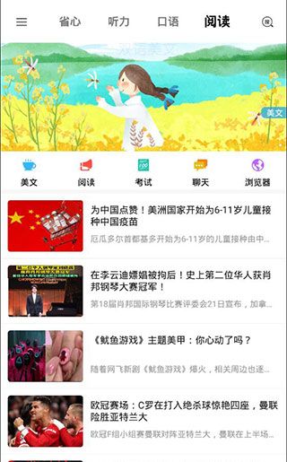 4、最后是阅读页面,最上方图片是推荐阅读的美文入口,点击即可进入,紧接着是阅读分类,它们包括了美文、阅读、考试、聊天、浏览器这5大类别,再下面则是最近一些时事新闻,通过浏览这些可以有效提高用户的英语阅读水平。