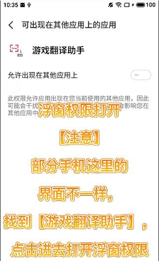 注意:部分手机这里的界面不一样,找到【游戏翻译助手】,点击进去打开浮窗权限。