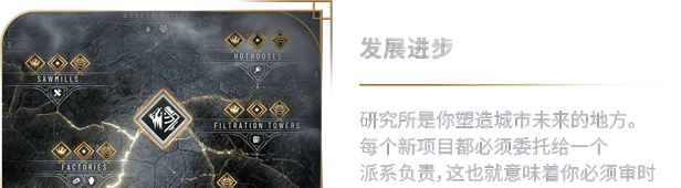 你的市民希望能在城市的管理运营方面参与意见。每个派系都有自己的意识形态和对未来的想法,但也有一个共同点——对权力的无尽渴求。你必须在议会厅中谨慎选择盟友。