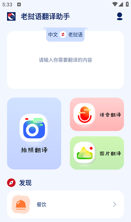 2、打开App,进入主界面,底部导航栏包含“翻译”“发现”两个主要板块。“翻译”页面为核心功能区,支持文本输入、语音翻译、拍照翻译。“发现”页面展示常用语句分类,如餐饮、住房、交通等。