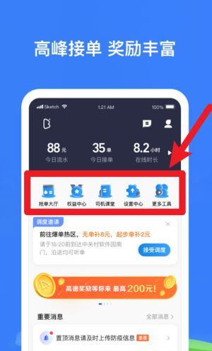 2、首页提供抢单大厅、司机课堂等功能模块,司机可根据需要灵活使用多种运营工具。