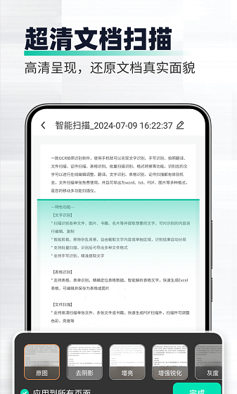 1、AI智能识别:自动检测文档边缘,精确裁剪和校正倾斜图像,恢复纸质文档的高清效果。