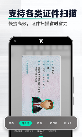 1、文件扫描模式:设置身份证、护照、驾照等文件的专用模板,两侧自动布局,符合官方提交标准。