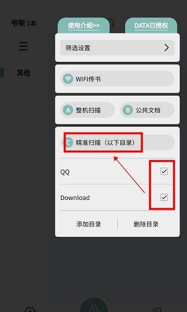 3、勾选已下载小说保存的目录,或是自行添加目录或是删除目录后点击【精准扫描】。